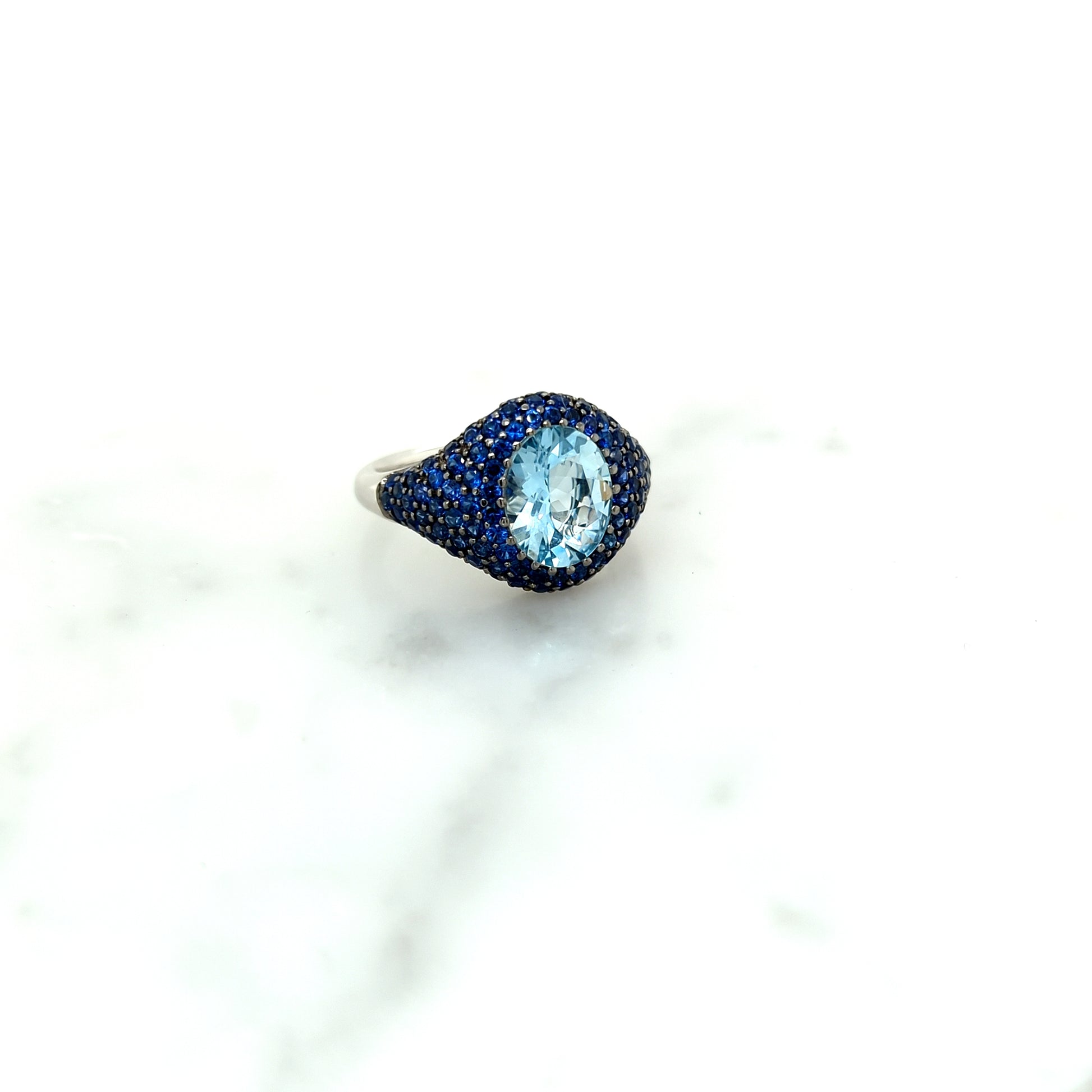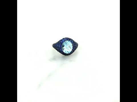 A beautifully cut 1.75ct oval aquamarine is surrounded by 1.74ct of pave set round blue sapphires. The ring features black rhodium which contrasts the blue gemstones and measures 14mm at the head